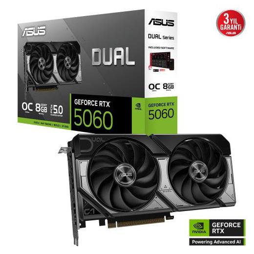 <h1>ASUS DUAL-RTX5060-O8G 8Gb 128Bit GDDR7 1xHDMI 3xDP GAMING Ekran Kartı</h1> <p> </p> <p>Model</p> <p>DUAL-RTX5060-O8G</p> <p>Grafik Motoru</p> <p>NVIDIA® GeForce RTX™ 5060</p> <p>AI Performansı</p> <p>623 TOPs</p> <p>Bus Standartı</p> <p>PCI Express 5.0</p> <p>OpenGL</p> <p>OpenGL®4.6</p> <p>Video Belleği</p> <p>8GB GDDR7</p> <p>Saat Hızı</p> <p>OC modu: 2565MHz<br /> Varsayılan mod: 2535MHz (Artırılmış Hız)</p> <p>CUDA Çekirdeği</p> <p>3840</p> <p>Bellek Hızı</p> <p>28 Gbps</p> <p>Bellek Arayüzü</p> <p>128-bit</p> <p>Çözünürlük</p> <p>Dijital Maksimum Çözünürlük: 7680 x 4320</p> <p>Arayüz</p> <p>Var x 1 (Yerleşik HDMI 2.1b)<br /> Var x 3 (Yerleşik DisplayPort 2.1b)<br /> HDCP Desteği: Var (2.3)</p> <p>Maksimum Ekran Desteği</p> <p>4</p> <p>NVlink/ Crossfire Desteği</p> <p>Yok</p> <p>Aksesuarlar</p> <p>1 x Hızlı Kurulum Kılavuzu<br /> 1 x Teşekkürler Kartı</p> <p>Yazılım</p> <p>ASUS GPU Tweak III ve MuseTree ve GeForce Game Ready Sürücüsü ve Stüdyo Sürücüsü: lütfen tüm yazılımları destek sitesinden indirin.</p> <p>Boyutlar</p> <p>228 x 123 x 50 mm<br /> 8.98 x 4.84 x 1.97 inç</p> <p>Önerilen Güç Kaynağı</p> <p>550W</p> <p>Güç Bağlantıları</p> <p>1 x 8 pim</p> <p>Slot</p> <p>2.5 Yuva</p> <p> </p>