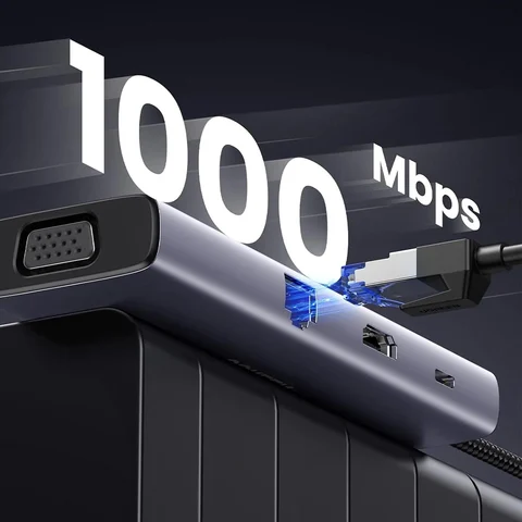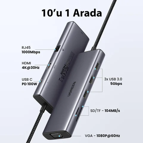 1 x Ugreen 10’u 1 Arada Type-C to 3x USB-A3.0 5Gbps Gigabit Ethernet HDMI VGA Kart Okuyucu Çoklayıcı Hub